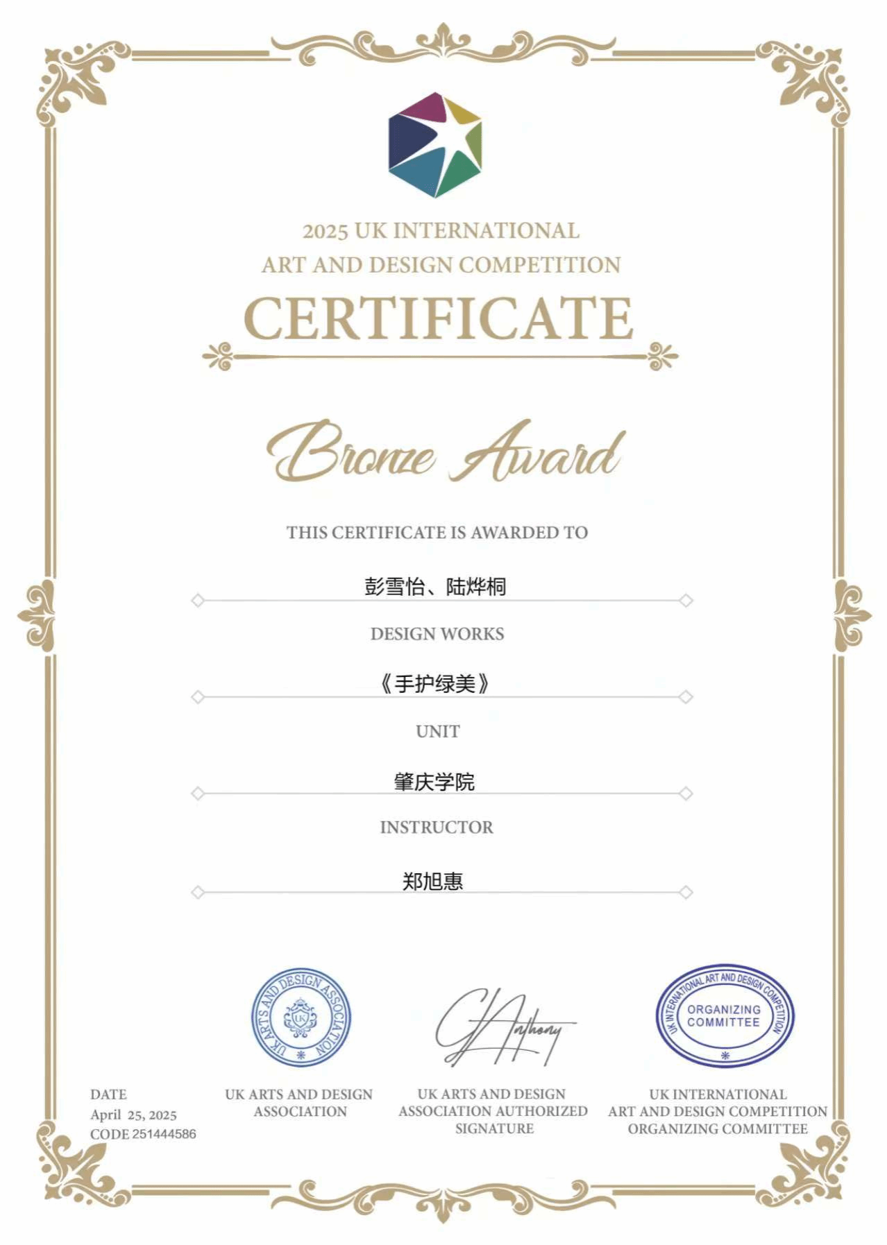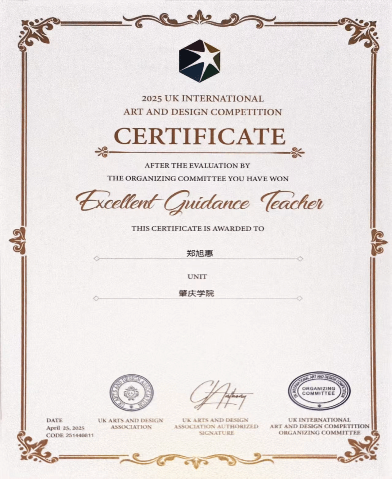 近日,由英国艺术设计协会(UK-AADA)主办的2025英国国际艺术设计大赛全球评审结果正式揭晓。威廉体育郑旭惠老师指导的参赛作品,赢得国际评审委员会高度赞誉,最终斩获:金奖、铜奖、优秀奖各1项,郑旭惠获评优秀指导教师。
