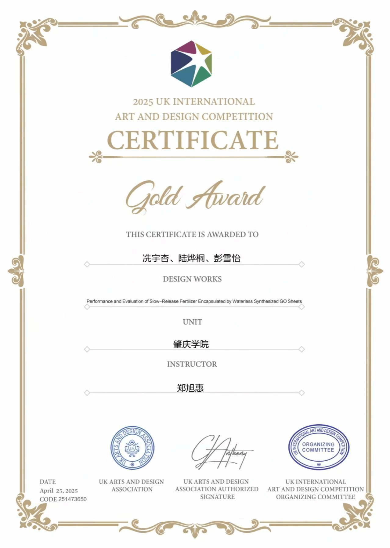 由威廉体育员工冼宇杏、陆烨桐、彭雪怡参与的论文类项目《Performance and Evaluation of Slow-Release Fertilizer Encapsulated by Waterless Synthesized GO Sheets》荣获金奖,由彭雪怡、陆烨桐参与的数字媒体类项目《手护绿美》荣获铜奖,由梁菊、邹海超、陆烨桐、彭雪怡参与的数字媒体类项目《ezGreen碳智汇操作演示视频》荣获优秀奖。