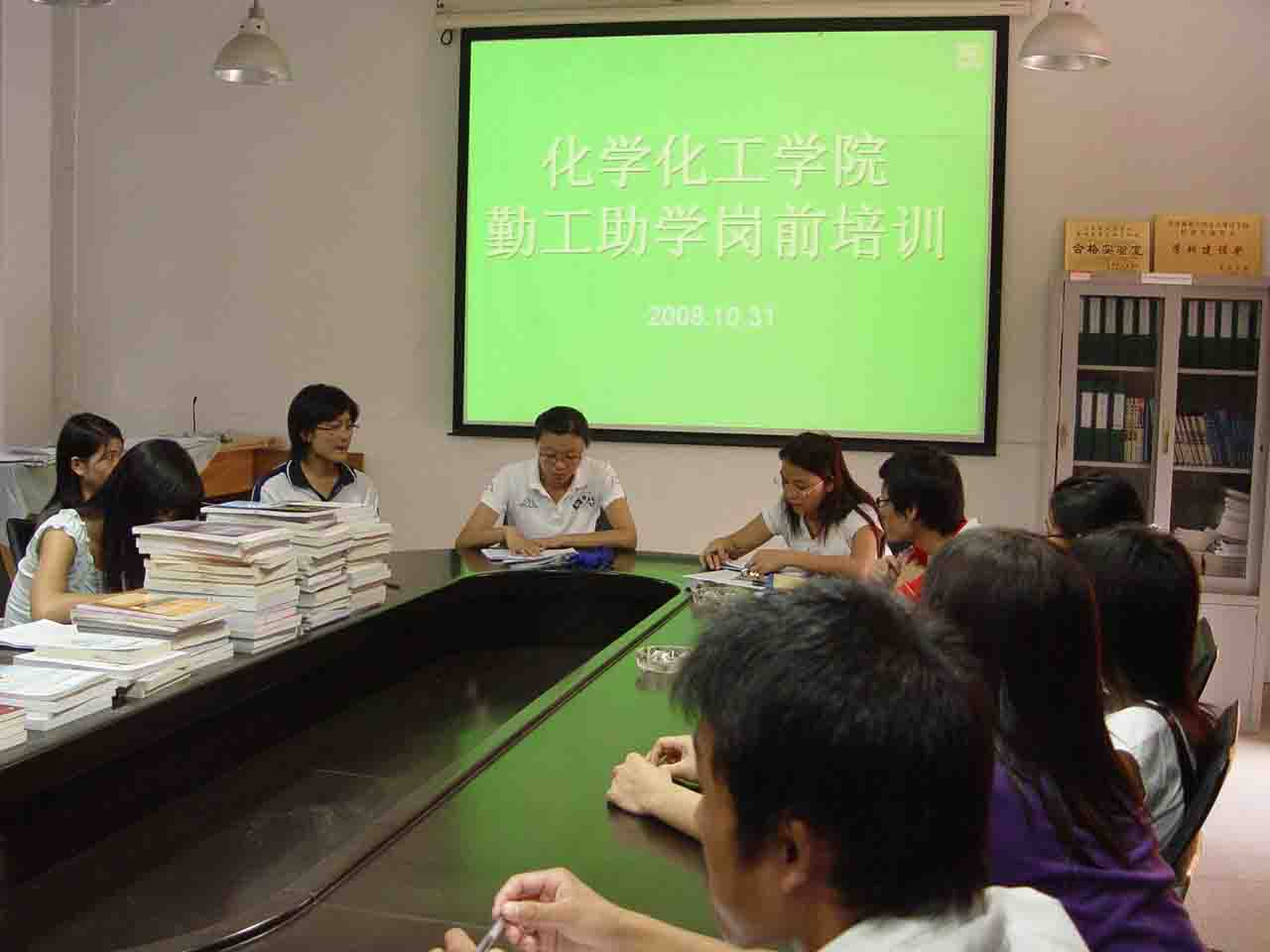 10月31日下午,在公司院楼会议室进行了一次勤工助学岗前培训。 会议开始后,胥家桢辅导员首先对08届14个参加勤工助学岗前培训的员工分配其各自的岗位。然后,06、07届勤工助学的优秀员工先后向08届的新生浅谈了他们过去工作所获得的经验,让08届的新生们对勤工助学这方面有了更深的认识和了解。在07届优秀勤工助学员工发言后,公司副书记陈玉华对这次会议作了小结,其中重点提到六点:1、按时签到2、上岗带好工作证3、礼貌待人4、做事有头有尾5、要吃苦耐劳6、工作时要兼顾好学习。陈玉华副书记发言后,胥家桢辅导员向同学们补充了几点并提出了很好的建议。