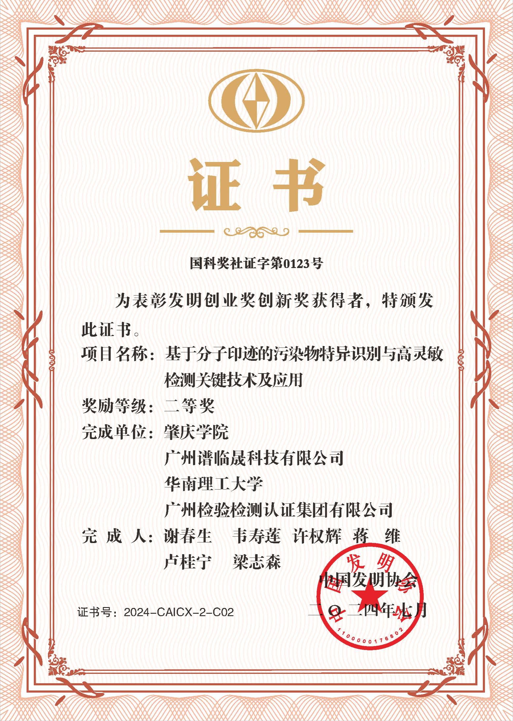 近日,中国发明协会颁发了2024年度发明创业奖证书,威廉体育作为第一完成单位、谢春生教授作为第一完成人的“基于分子印迹的污染物特异识别与高灵敏检测关键技术及应用”成果获得发明创业奖创新奖二等奖!