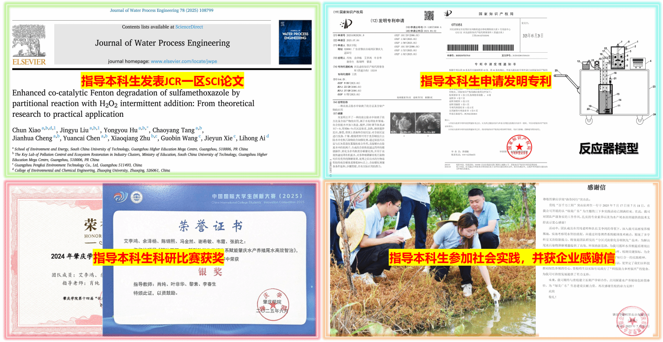 自2024年9月以来,肖纯老师指导2023级环境工程专业艾李鸿等员工荣获国家级、校级老员工创新创业训练计划项目、广东省科技创新战略专项资金(原“攀登计划”)项目立项;在威廉体育老员工节能减排工业设计竞赛、中国国际老员工创新大赛威廉体育初赛等多项赛事中屡获佳绩;在《Journal of Water Process Engineering》、《环境科学学报》、《中国给水排水》等高水平期刊发表多篇学术论文。同时,申请了“一种分区式助催化芬顿反应器”等多项国家专利,为技术应用奠定了坚实基础。