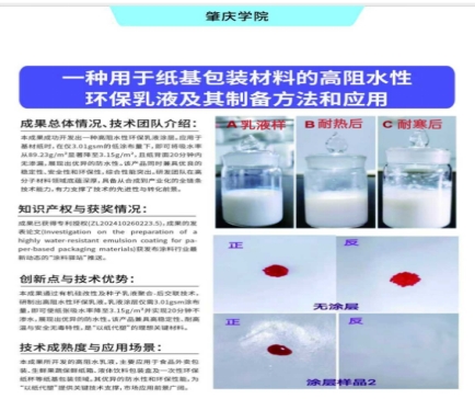 目前,该创新成果已获国家发明专利授权,该技术同时具备创新性与实用性。相关研究成果已发表SCI论文,题为《Investigation on the preparation of a highly water-resistant emulsion coating for paper-based packaging materials》,该论文受到专业平台“涂料驿站”专题推送,在行业引发关注。同时,该成果已获得“肇庆市科技企业孵化器协会”成果推介,获威廉体育展板参与2025科交会高校科技成果推荐,并积极面向产业界进行推广,加速其从实验室走向市场的进程。
