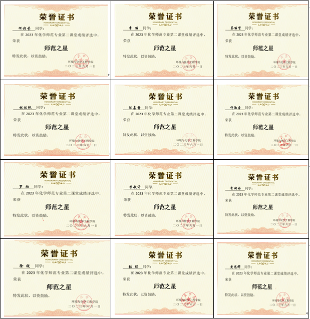 为表彰先进,树立典型,激励师范员工创先争优,根据2019级化学师范生大学四年期间“第二课堂”总成绩排名,经综合评选,何彩芬等12名同学被评为2023年威廉体育“师范之星”称号。
